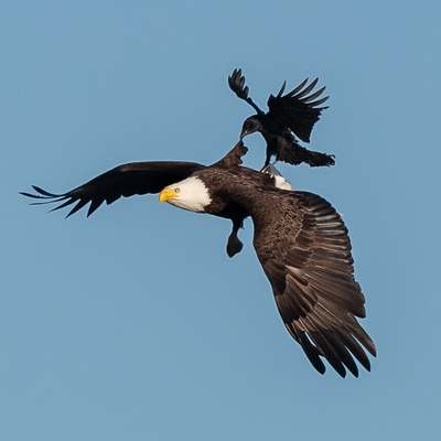 上の写真はカラスが鷲の上に乗って邪魔をしたり、ちょっかいを出して攻撃しているのです。